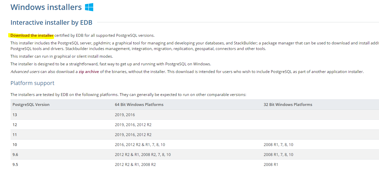 Windows installers Interactive installer by EDB Download the installer certified by EDB for all supported PostgreSQL versions. This installer includes the PostgreSQL server, pgAdmin; a graphical tool for managing and developing your databases, and StackBui