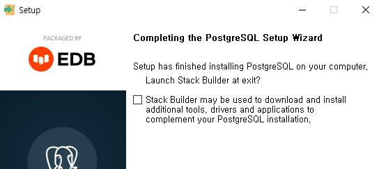설치가 진행되고 끝나면 다음과 같은 화면으로 바뀌는데 여기서 스택 빌더는 현재 우리에게 별 필요가 없으니 설치를 해주지 않아도 된다.