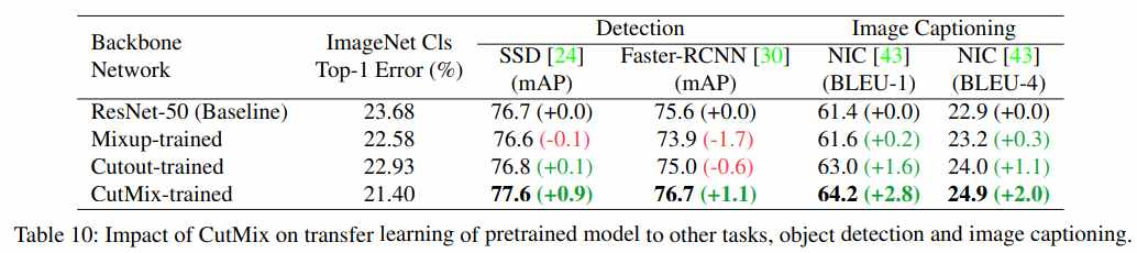 위 사진은 전이학습으로 객체 탐지를 수행한 결과에 대해 정리한 표입니다. 기본 베이스 라인 대비 Detection에서 mAP기준 최대 1정도가 증가한 것을 확인할 수 있습니다. 반대로 이전까지 제시되었던 Mixup이나 Cutout의 경우 성능이 떨어졌음을 확인했습니다. 이 밖에도 다양한 실험을 진행해 성능지표를 정리해서 논문에서는 소개하고 있습니다. 전반적으로 Mixup이나 Cutout 대비 안정적인 성능 향상을 보여주고 있었습니다.