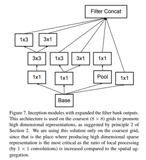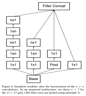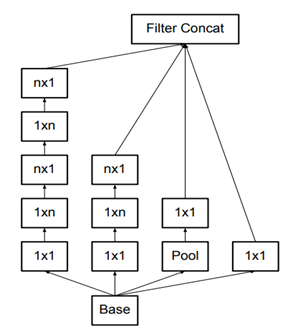 그럼에도 이렇게 1*n, n*1 두개의 layer를 사용하는 것이 33%( (3+3)/3*3 ) 더 비용이 절감된다고 합니다. 이에 반해 3*3을 2*2로 분해하면 11% (2*2*2 / 3*3)밖에 절감이 안 된다고 합니다. n*n convolution은 1*n 뒤에 n*1 convolution이 오는 형태로 대체할 수 있으며, 여기서 n이 커짐에 따라 계산 비용 절감이 극적으로 증가한다고 주장할 수 있습니다. 실험을 통해 이를 알아본 결과, grid-size가 큰 초반부 layer에서는 효과가 잘 나오지 않지만 중후반부 layer에서는 7*1, 1*7 convolution을 사용하면 좋은 효과를 얻을 수 있다고 합니다. Feature map size가 12 ~ 20 정도일 때 좋은 결과가 있었다고 합니다.