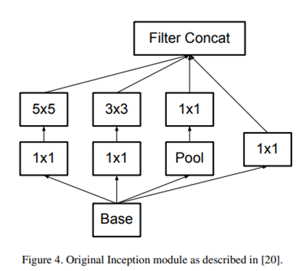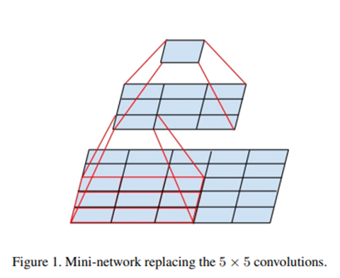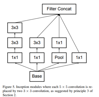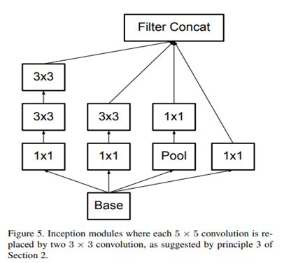결과적으로 3*3 convolution보다 큰 필터는 3*3 convolution으로 분해하는 것이 좋고 실제, 아래 그림처럼 inception에서는 5*5 convolution을 두 개의 3*3 conv로 대체해 사용하고 있습니다.