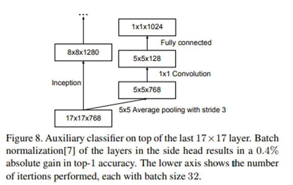 GoogLeNet에서 Auxiliary Classifier를 활용하면 신경망이 수렴하는데 도움을 준다고 소개했습니다. 하지만, 이를 실험해본 결과 효과가 없었다고 합니다.. 다만 Auxiliary Classifier에 drop out이나 batch norm이 있다면, main classifier의 성능이 향상되는 결과가 나와 Auxiliary Classifier는 성능 향상보다는 정규화 효과가 있을 것으로 추측합니다.