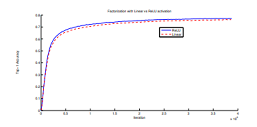 3x3 convolution을 2번 사용하여 5x5 convolution을 분해할 때, 첫 번째 3x3은 linear activation, 두 번째 3x3은 ReLU activation을 사용하는 것과 둘 다 ReLU activation을 사용하는 것을 실험합니다. 아래 그래프가 그 결과입니다. 두 3x3 convolution에 ReLU를 사용한 것이 정확도가 더 높았습니다. 추가적으로 배치 정규화(Batch normalization)을 사용하면 더 정확도가 높아지게 됩니다.