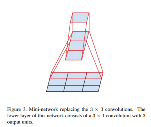 2*2 convolution과 같이 더 작은 단위로 factorizing을 할 수 있지만 이 방법보다는, n*1과 같은 asymmetric convolution을 사용하는 것이 훨씬 좋다고 합니다. 아래 그림처럼 3*1 convolution 뒤에 1*3 convolution을 사용한 2-layer를 sliding하는 것과 3*3 convolution의, receptive field는 동일하다고 합니다.