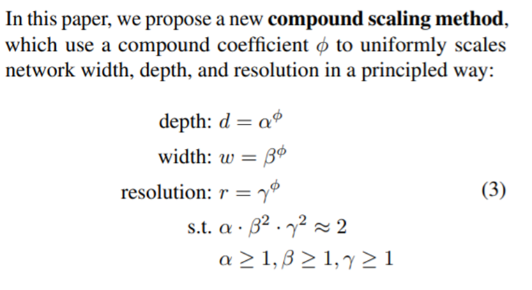 compound coefficient φ(논문 기호를 복사하면 이렇게 나오네요..?)를 사용해 위 수식처럼 scaling합니다. 이 때 알파, 베타, 감마는 small grid search에 의해 결정되는 상수(고정)입니다. Compound coefficient는 사용자의 GPU 성능에 따라 조절할 수 있는 파라미터라고 합니다. Depth를 2배하면 FLOPS가 2배 증가하지만 width나 resolution은 2배 증가하면 4배로 증가해 total FLOPS를 α · β^2 · γ^2 ≈ 2로 설정합니다. 이 덕분에 어떤 compound coefficient를 설정해도 total FLOPS가 2^ φ만큼만 증가한다고 합니다.