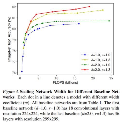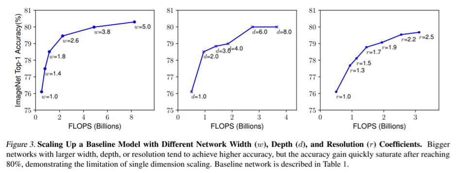 위 그림은 앞서 설명한 d, w, r을 증가했을 때의 성능 비교 표입니다. 왼쪽에서부터 Width, Depth, Resolution 순이며 w를 증가시킬 때는 나머지 두 d, r은 고정시켰으며 d를 비교할 때는 w, r를 고정, r을 비교할 때는 d, w를 고정하고 r만 증가시키는 방향으로 진행했습니다. 그 결과 각각을 증가시킬 때 성능이 향상되는 것을 볼 수 있습니다. 하지만, 값이 커질수록 성능 향상 폭은 작아지는 것을 확인할 수 있습니다.