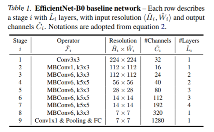 Model Scaling은 layer Operator가 고정되어 있어 Baseline Network가 중요하다고 합니다. 앞서 언급했던 것처럼 기존 CNN에서도 적용해볼 것이지만 효과를 더 극대화하기 위해 새로운 network를 설계했고 이를 EfficientNet이라 칭합니다. NAS로 정확도 및 FLOPS를 모두 챙기도록 최적화했고, 가장 기본이 되는 네트워크를 EfficientNet-B0로 부릅니다. 자세한 구조는 아래와 같습니다.