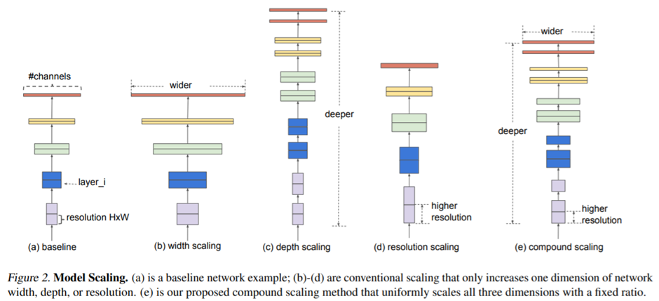 Model scaling 방법들이고 오른쪽 e가 논문에서 제안한 compound scaling 방법입니다. 이전까지 있던 scaling 방법을 잘 조합해서 모델을 확장한 것이라고 보면 될 것 같습니다.
