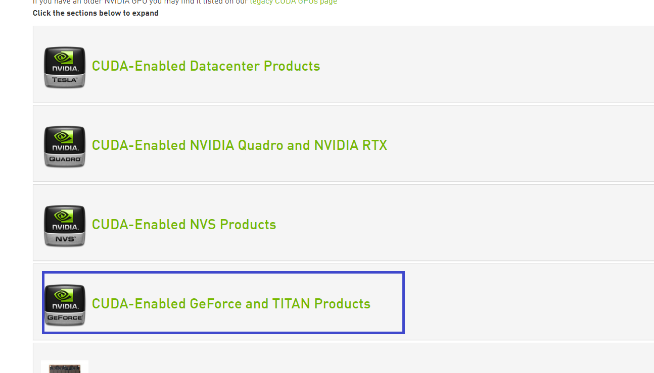 링크를 누르면 아래와 같은 화면을 마주할 수 있고 일반적으로는 GeForce and TITAN ~ 이 부분을 누르면 사용하고 있는 제품의 Compute Capability를 확인할 수 있을 것이다.