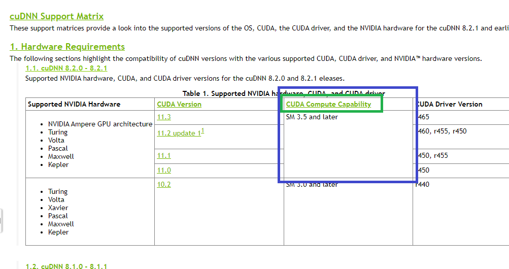 여기서 이외에도 확인을 해주어야 할 부분이 CUDA Compute Capability인데 해당 스펙이 되어야 cuDNN을 사용할 수 있음을 뜻한다. 아래의 사진에서 확인할 수 있듯이 cuda 11버전과 cuDNN 8.2.0이상을 사용하기 위해서는 3.5 이상이 되어야 함을 볼 수 있다. 또한, 자신의 gpu스펙은 초록 사각형 부분을 클릭하면 확인할 수 있다.